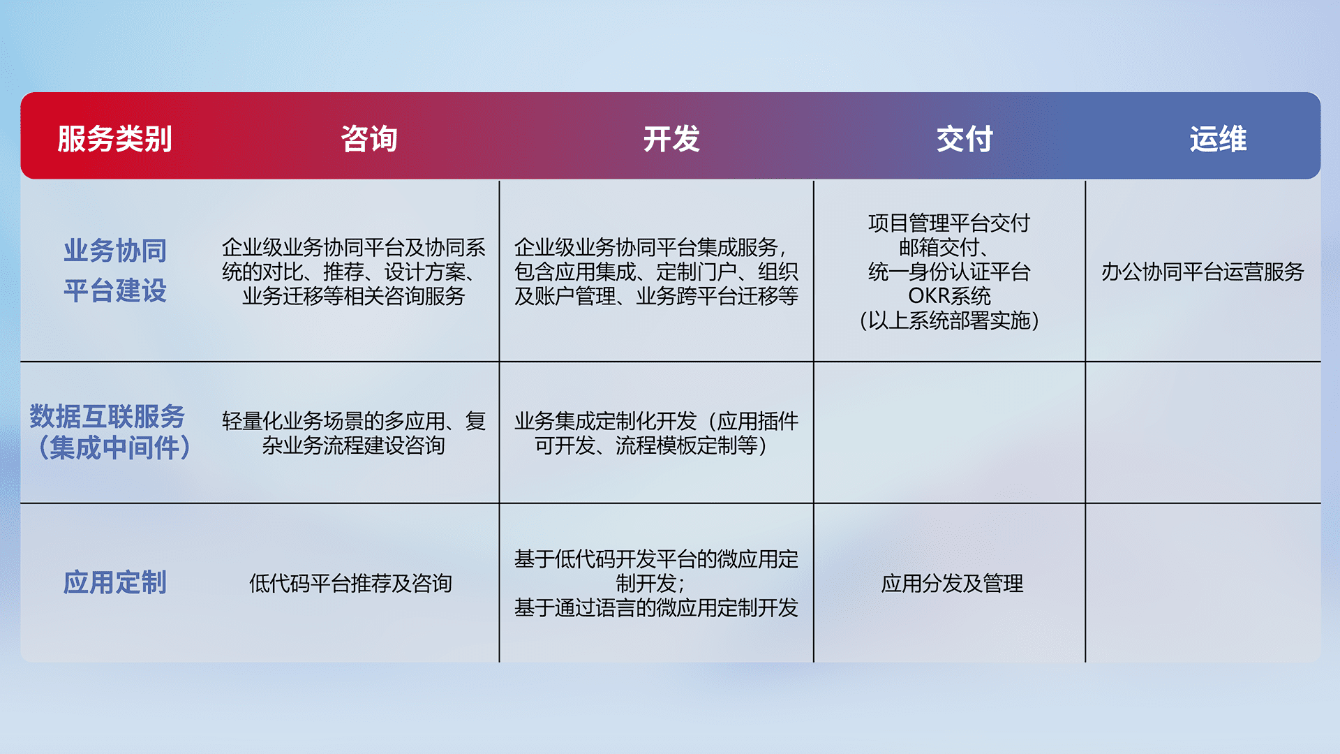 针对钉钉、、、、企微、、、、IDaas等平台级产品提供产品的规划、、方案、、交付、、、定制化开发等服务,,,实现如统一协同办公、、、、智能客户服务、、、混合会议管理、、、智能数据查询、、、、等业务场景,,,,实现数字化转型。。