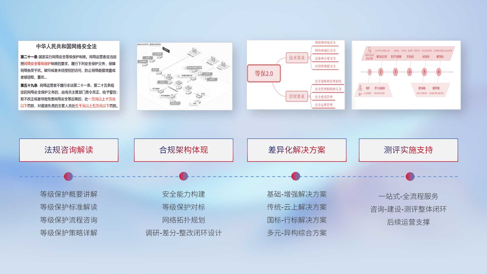 通过专业的法律咨询解读、、、、合规架构体现、、、差异化解决方案、、、测试实施支持等服务,,,为客户量身打造等保合规体系。。。